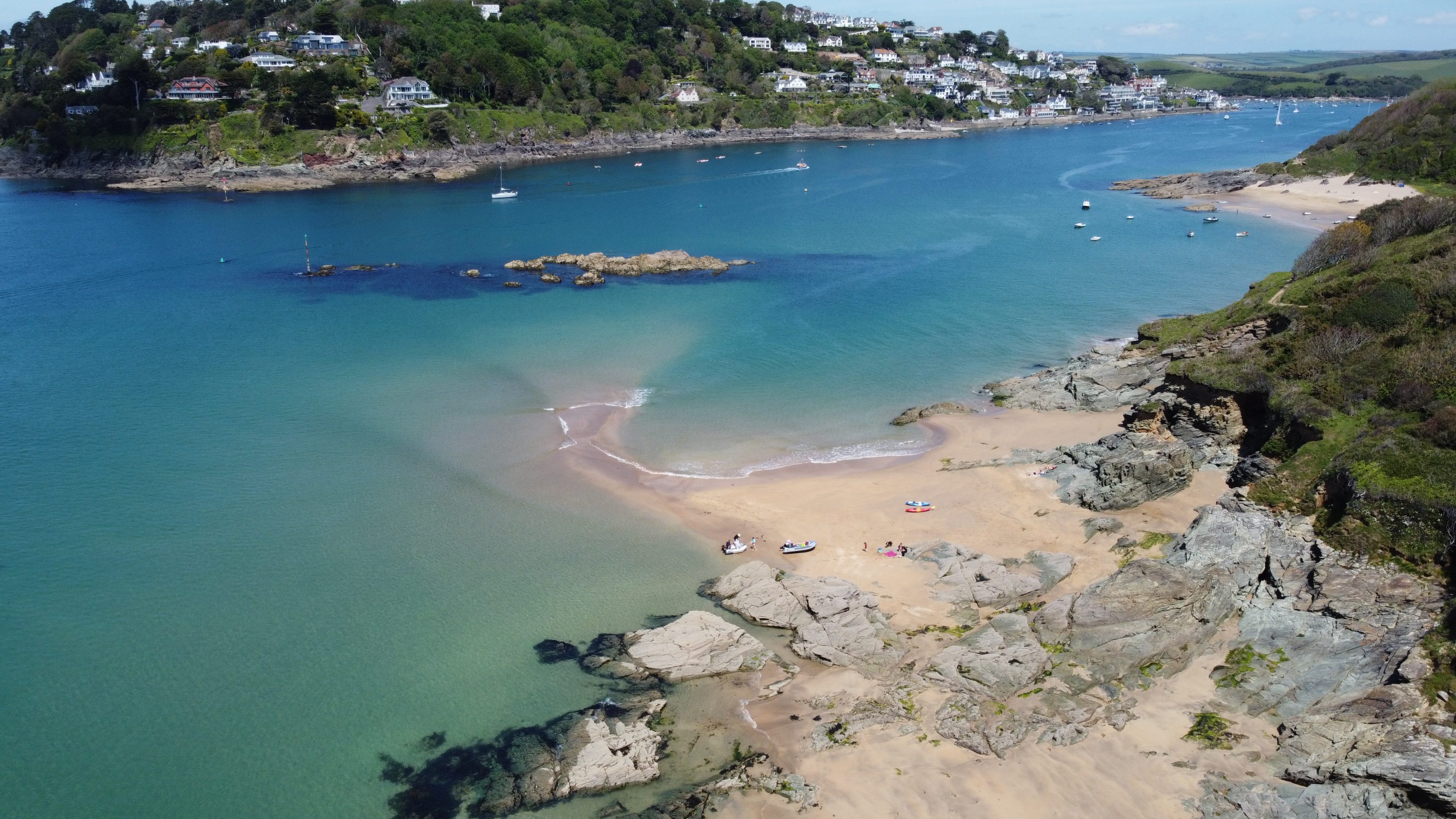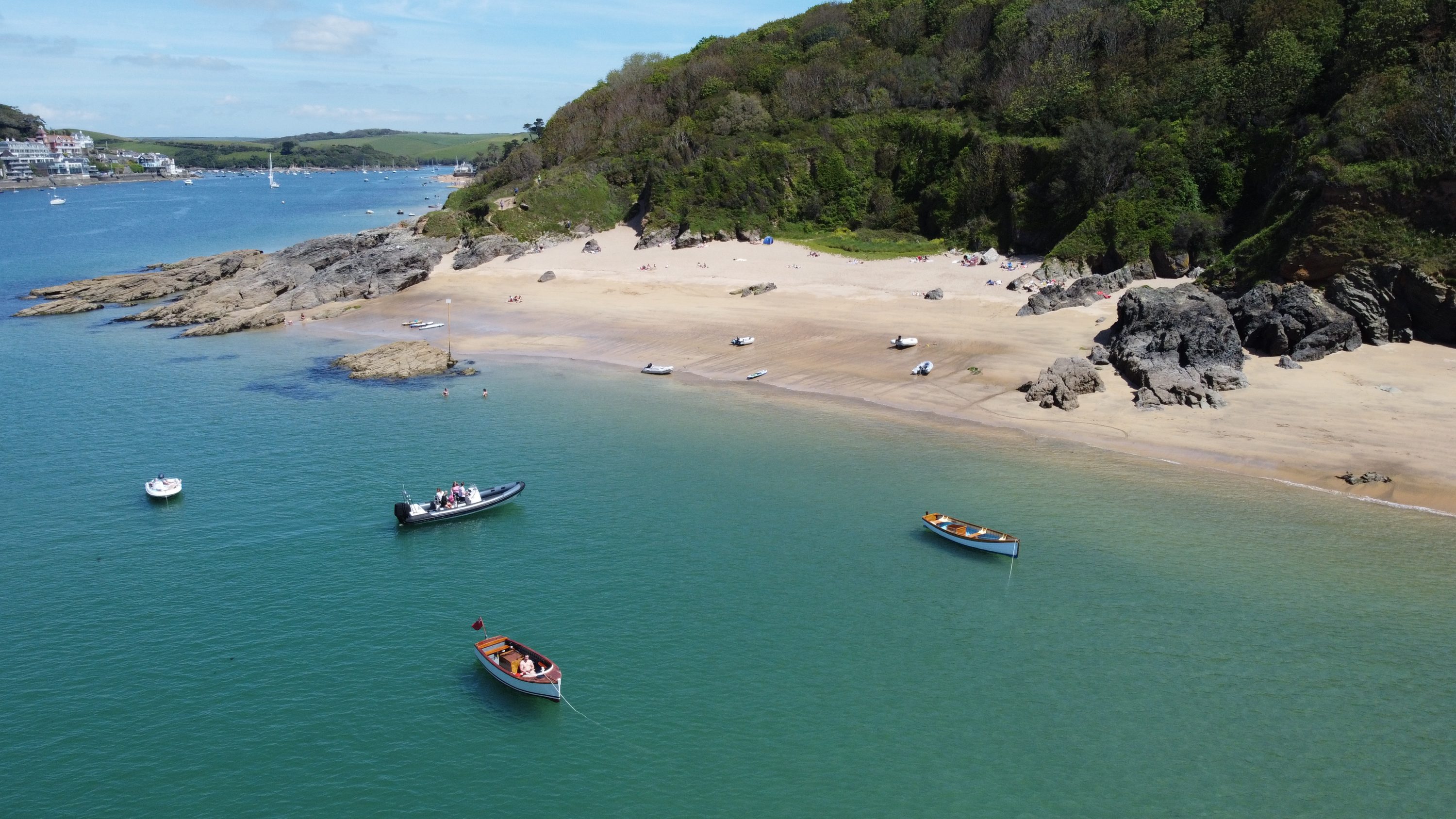 Just across the Salcombe Estuary, tucked between Mill Bay and East Portlemouth, lies Sunny Cove, a crescent of golden sand that glows in the afternoon light. The beach sits beneath a grassy headland and feels like something from a Mediterranean dream, with shallow turquoise water and soft sand underfoot.